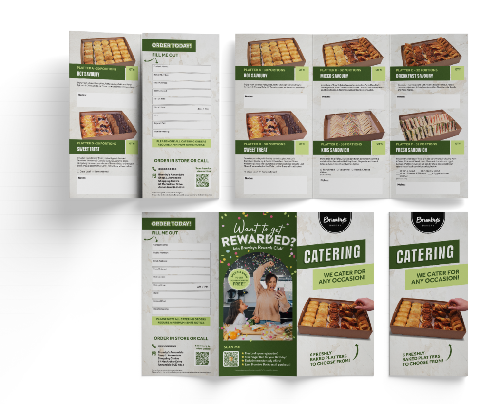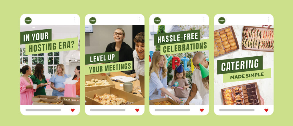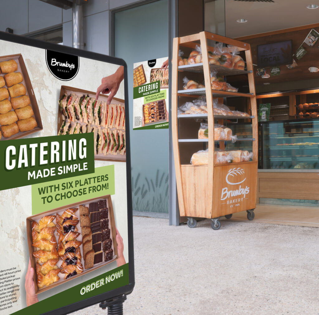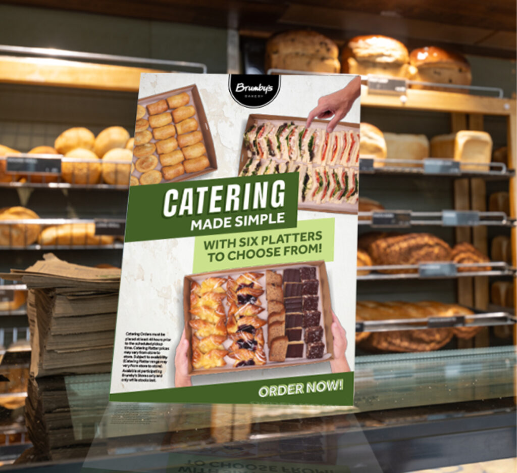 Overview: To support the launch of Brumby’s new offering of catering, I was tasked with designing assets that were a fresh take on the usual Brumby’s design. I carried through the signature dark green and introduced a new brighter green to add a new fresh feel. I also steered away from the more traditional typefaces that Brumby’s typically used and a sharper bolder font for the campaign lockup.